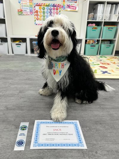 Jace the Therapy Dog was born on January 27, 2022, in Suwanee, Georgia and was bred by Christy at Mini Goldendoodles of Georgia. Jace is a Miniature Berne doodle (a mixture of a Bernese Mountain Dog and Poodle). He is non-shedding and is hypoallergenic. Jace is black and white, with a hint of brown. While in Georgia, Jace went through ENS (Early Neurological Stimulation) training, sound desensitizing and had plenty of puppy and human socialization. Jace was enrolled in a puppy group classes and received one on one obedience training in his home, in the community, as well as at training facilities. Jace earned his Blue Ribbon, as an AKC S.T.A.R. Puppy Certification. Jace then graduated from his month-long board and training obedience program from Greenleaf in Millstone, NJ, where he then became certified as an AKC Canine Good Citizen (AKC CGC). On Jace’s second birthday party, he performed tricks and then received the award of becoming a certified AKC Trick Dog Novice. Later that year, Jace attended another month long advanced obedience board and train program at Bucks dog training in Princeton, NJ, where he refined his obedience skills and was tone trained with an E-Collar. On Jace’s Third Birthday he performed another 10 tricks for his friends at The Social Spectrum where he was awarded with being an AKC Intermediate trick dog. The next week, Jace showed off all his skills to Shelly Leibowitz, where he qualified to now be an AKC Community Canine (AKC CGCA). Currently, Jace goes for training with Christine from The Canine Code, where he continues to work and fine his skills.